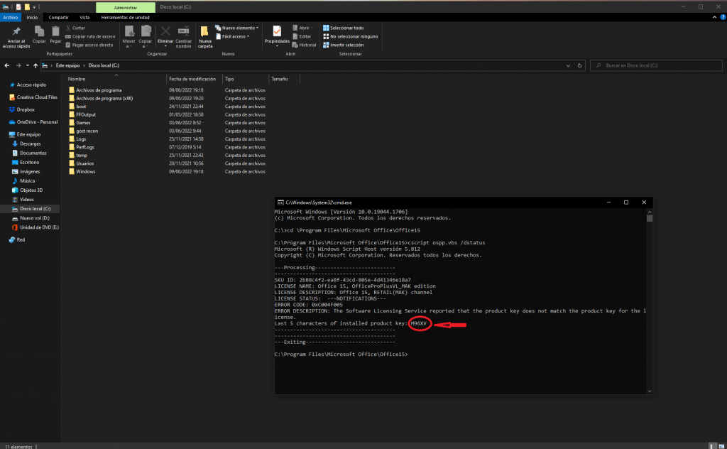 7- Copie y pegue el siguiente comando » cscript ospp.vbs /unpkey: M96XV «, reemplace los números por los últimos dígitos que aparecieron de su clave en el paso numero 5 y presione enter.