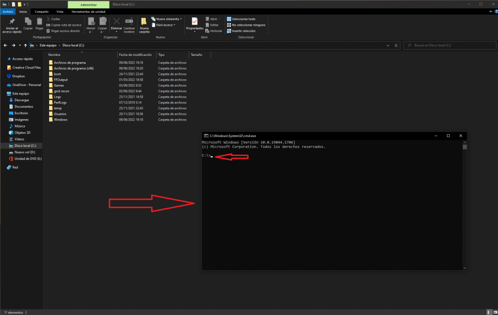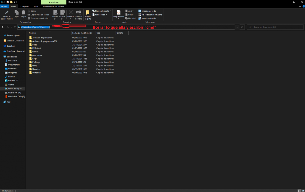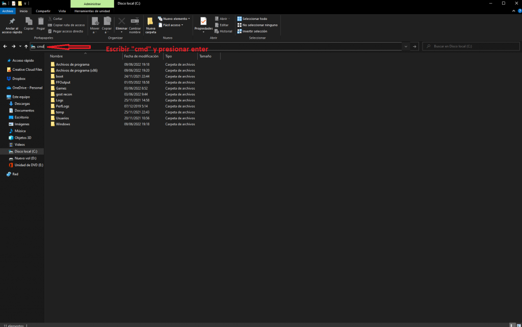 2- Una vez dentro de la unidad «C:» ejecutaremos «cmd» escribiendo en el explorador de archivos la palabra «cmd» y presionando enter.