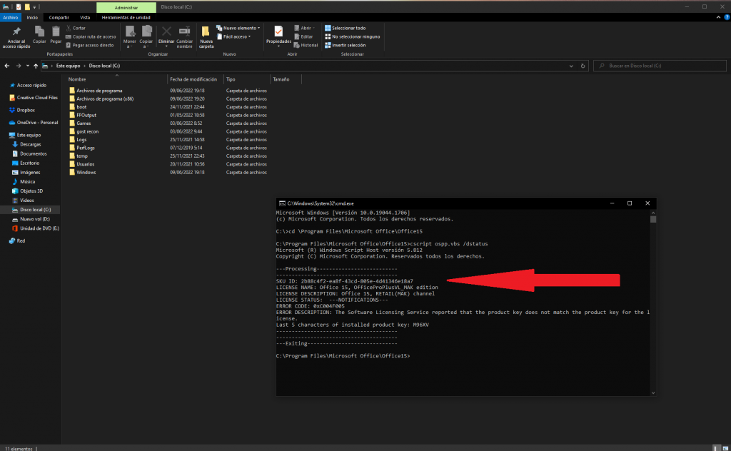 5- Luego ejecutaremos el comando para comprobar que clave se encuentra registrada en la raíz del sistema operativo. Copie y pegue el siguiente comando » cscript ospp.vbs /dstatus » y presione enter.